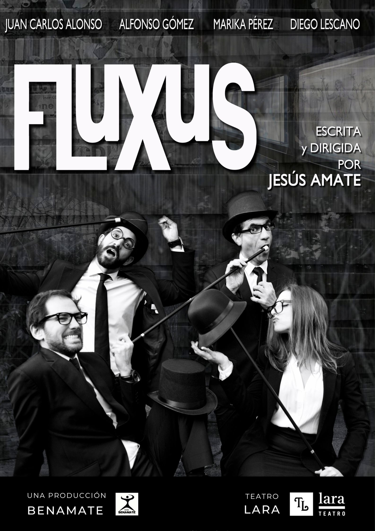Fluxus surge como segunda parte de la propuesta No se puede mirar, tras el éxito alcanzado en 2014 con el Premio Talent Madrid. Nace con la idea de profundizar en el teatro del absurdo. Una propuesta performática en la que la sala pierde las fronteras que lo límites propios de la lógica imponen, convirtiendo en escenario todo el espacio, o en grada toda la sala, o… para ser más claros, que el espectáculo fluya entre espectadores y actores perdiendo en algunos momentos los límites espaciales.