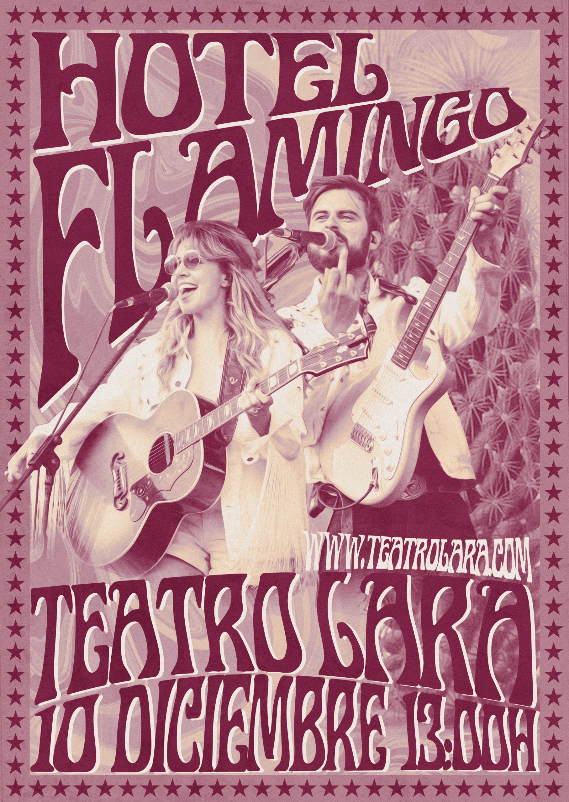 Rosco y Andrea Guasch vuelven al Teatro Lara, el lugar que les unió, para presentar el primer álbum de su proyecto musical Hotel Flamingo. Desde su gran debut en diciembre de 2019, en el festival organizado por la AECC en La Riviera, junto a artistas como Rozalén o Despistaos, Hotel Flamingo no ha parado de crecer. Tras sus conciertos en salas emblemáticas de Madrid, como Moby Dick o Sala El Sol, Hotel Flamingo llega al Teatro Lara para presentar “Discos y Vinilos”, primer álbum del grupo, producido por Eduardo Figueroa en Estudio A Sonido. Este álbum, que incluye 10