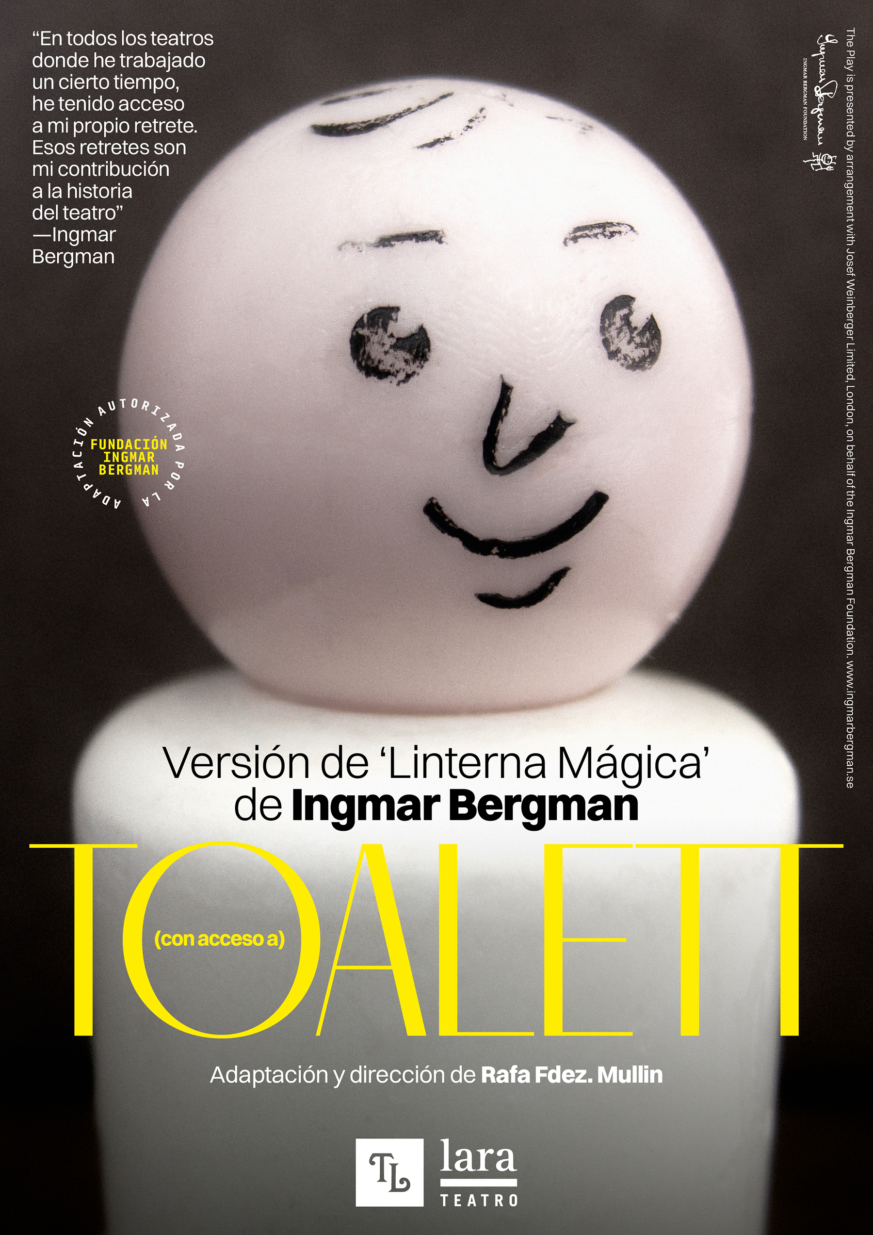 De Ingmar Bergman me gusta su ingenio, su perspicacia, su sentido del humor irónico y descarado y la complejidad de su personalidad. En mi adaptación de Linterna mágica presté especial atención a estos rasgos con el fin de que su carácter, el de Ingmar Bergman, estuviera presente y guiara la acción de la obra. Me gustaría pensar que, en Toalett (con acceso a), cierta parte esencial de Ingmar Bergman se filtra a través de sus recuerdos y confesiones, que su personalidad pervive en las vivencias, revelaciones y trastornos que él mismo nos cuenta, como personaje de la acción. De hecho, en la obra, es el propio Ingmar Bergman quien desencadena los conflictos que padece, como víctima y como verdugo, sometido a una vergüenza impuesta y a una culpabilidad que no admite cuestión, encerrado en la soledad de su desconfianza y de su miedo, amenazado de muerte por sus propios demonios. Y será él mismo, Ingmar Bergman, quien habrá de hallar la fortaleza para volver a la vida. La senda que se abre ante él es la de su propia conciencia.