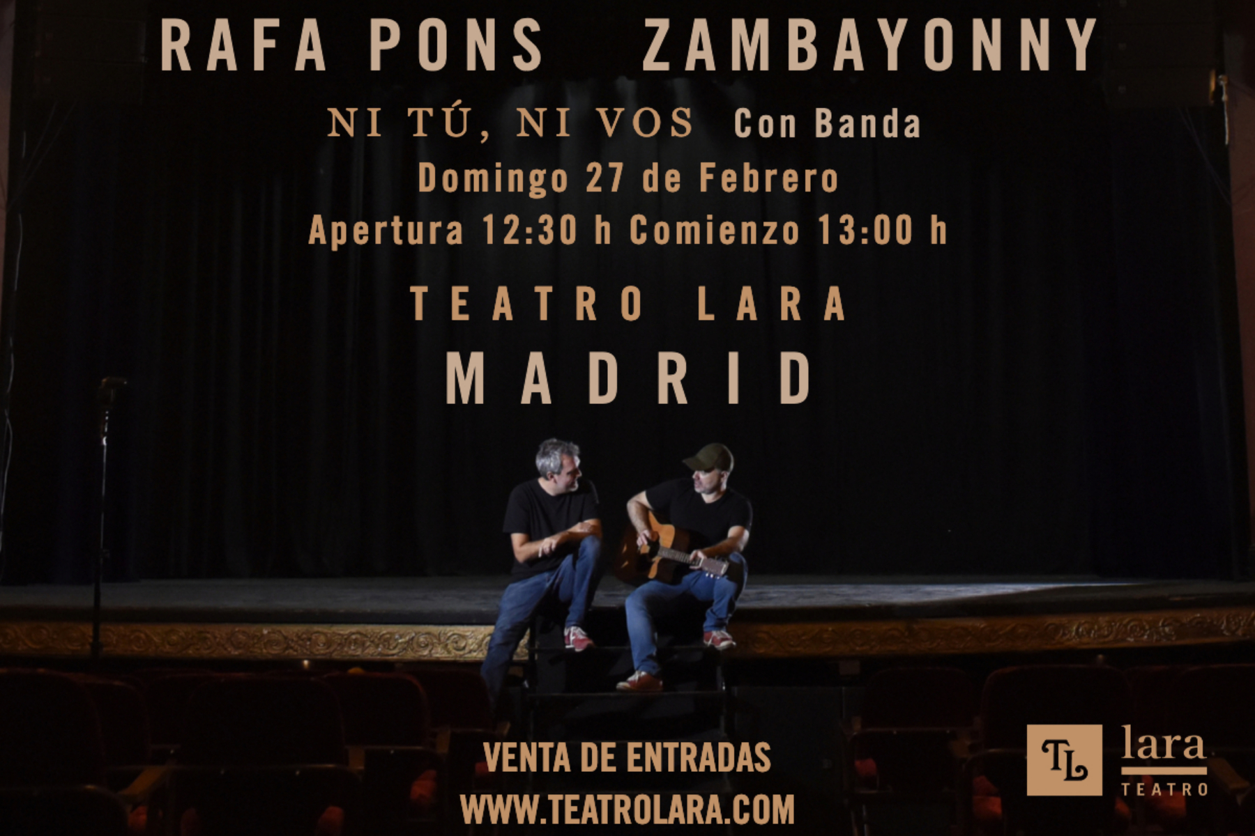 Rafa Pons y Zambayonnny, tras una gira por Argentina y Uruguay, vienen a España por primera vez con banda y prometen un espectáculo divertido y emocionante, pero, sobre todo, irrepetible donde cantarán temas de su repertorio habitual y también de “Ni tú, ni vos” su disco conjunto publicado recientemente.