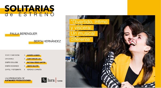 Solitarias de estreno tiene todos los ingredientes para convertirse en un musical muy personal y cargado de emociones. Se trata de una propuesta teatral que se apoya en el concepto de actriz como elemento principal para dar forma a este montaje. De hecho, el elenco está formado tan solo por las dos protagonistas: Cris, interpretada por Paula Berenguer y Lucía, por Berta Hernández.