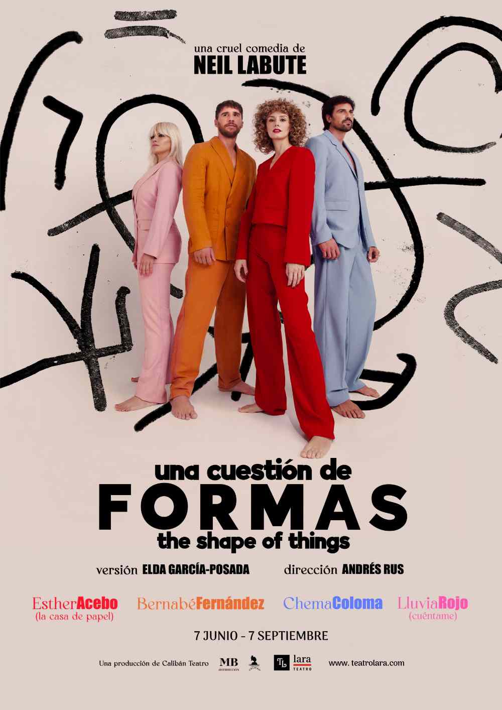 Esther Acebo (La Casa de Papel), Bernabé Fernández, Lluvia Rojo (Cuéntame) y Chema Coloma protagonizan Una Cuestión de Formas (The Shape of Things), de Neil LaBute, uno de los mejores autores americanos de comedia del siglo XXI. Estrenada y dirigida en 2001 por él mismo en el Almeida Theatre (el teatro más prestigioso de Londres), se trata de su obra más divertida y fascinante, una comedia negra brillantísima (de sorprendente final), donde nada es lo que parece... Con un humor corrosivo y políticamente incorrecto, pocas veces se ha visto en España una comedia así...